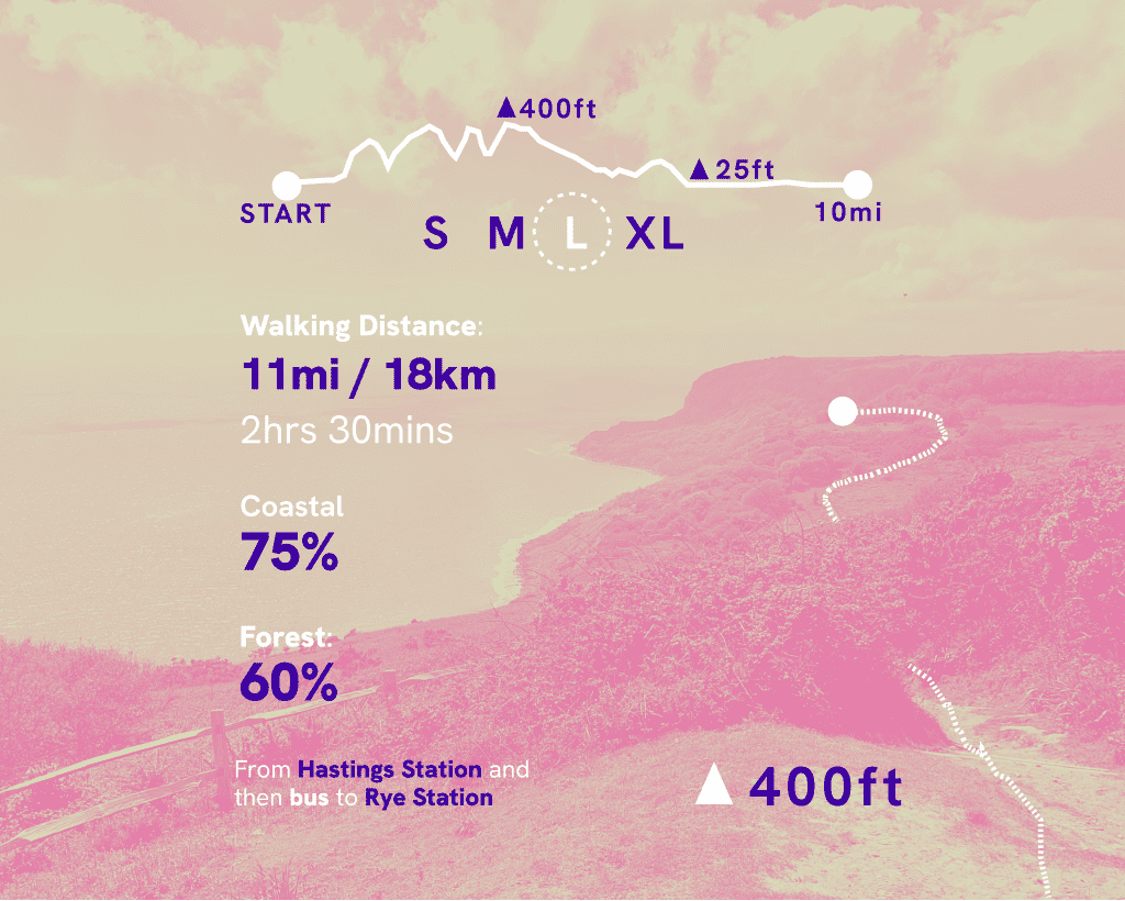 This walk takes 4-5 hours and is 11 miles in distance. It has 1,000 ft of climbing up steps and muddy tracks. In winter, the tracks are especially muddy. The walk features forest, coastal sections, and spectacular panoramic coastal views, including Hastings from above.